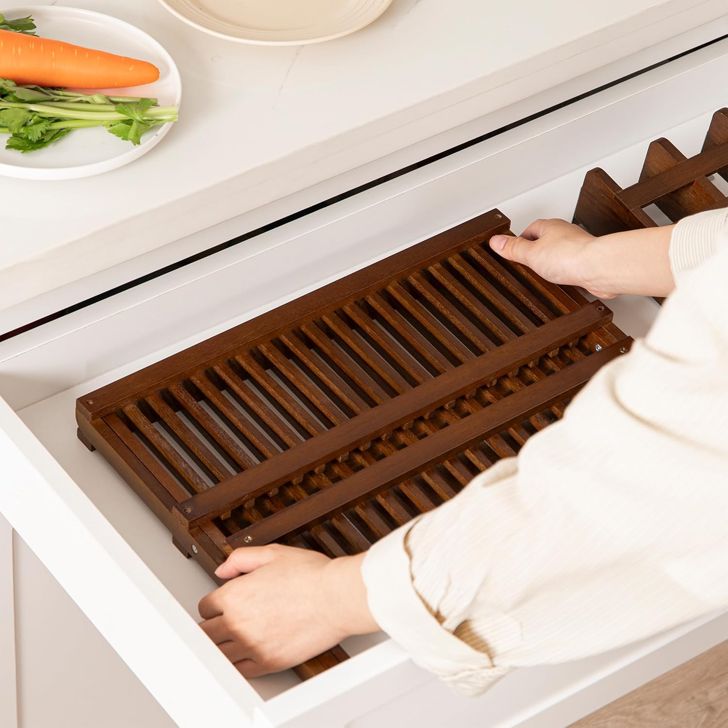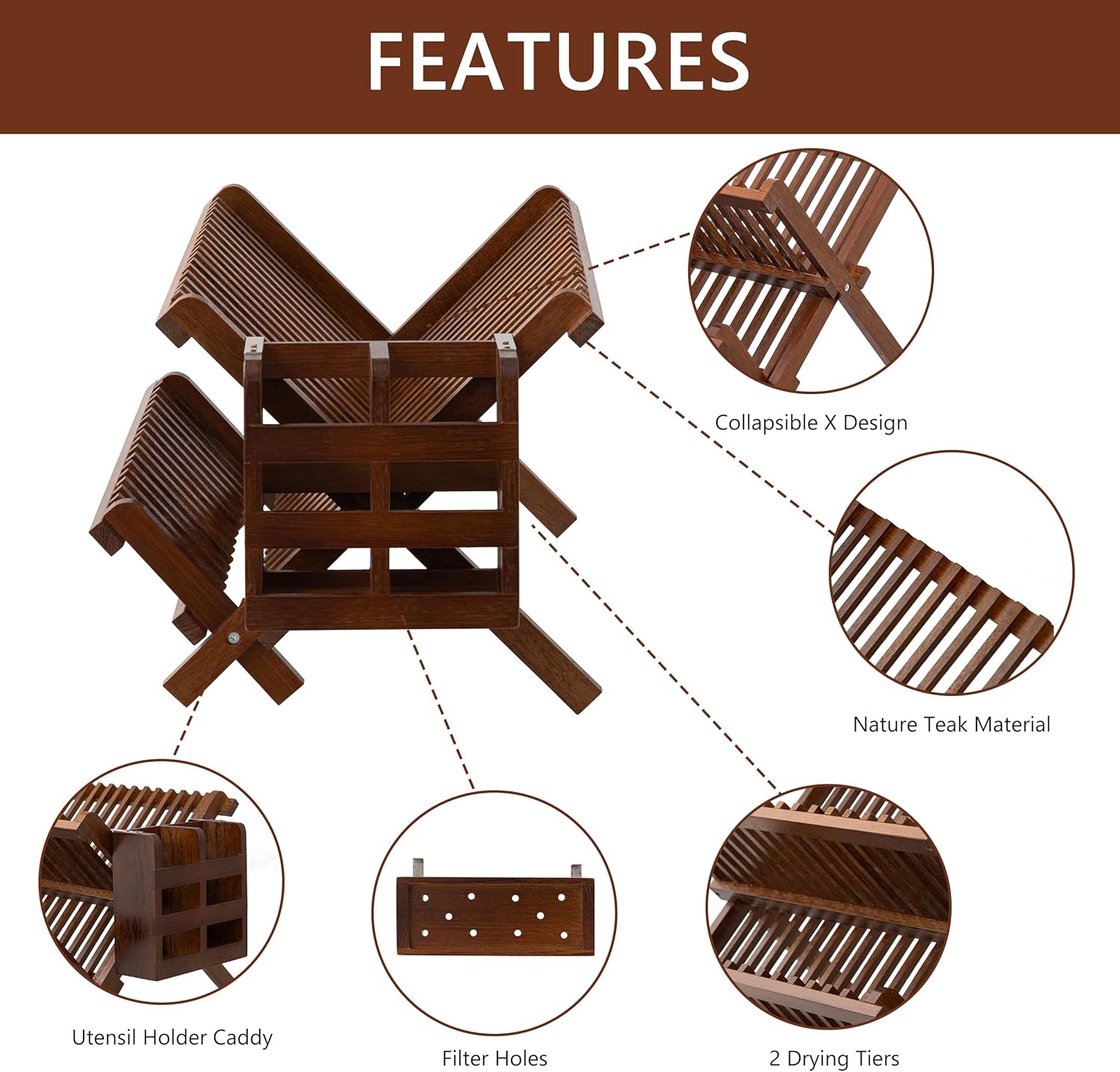 HBlife Dish Rack,Teak Folding 2-Tier Collapsible Drainer Dish Drying Rack with Utensils Flatware Holder Set